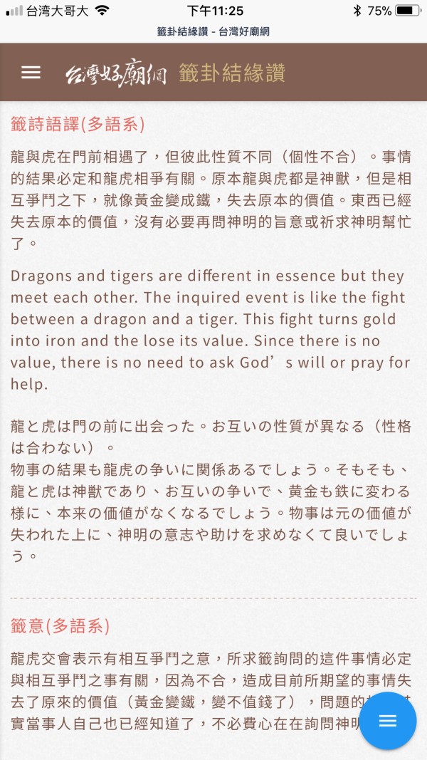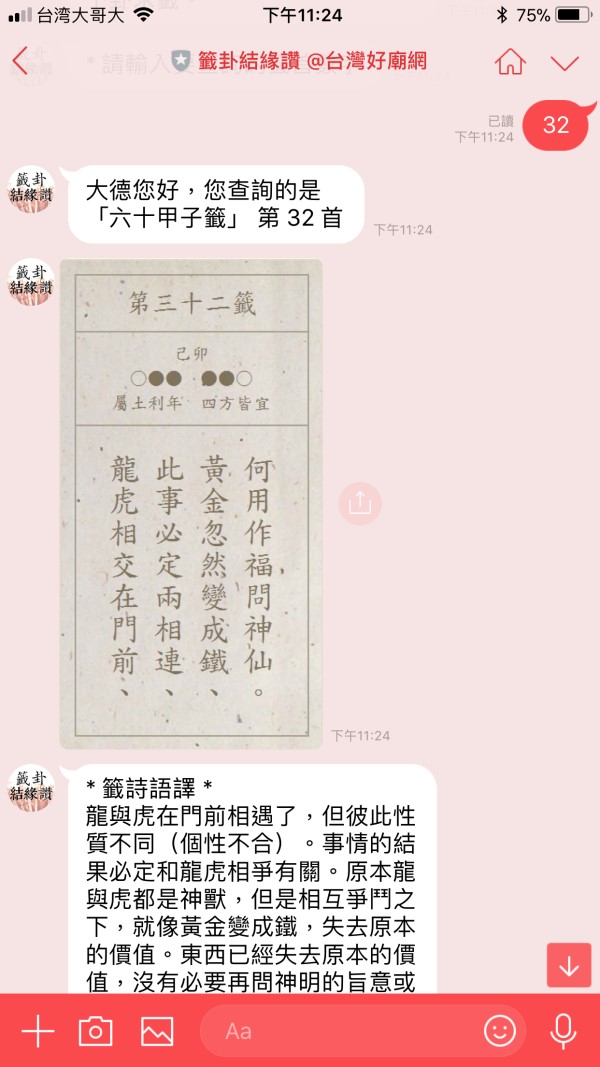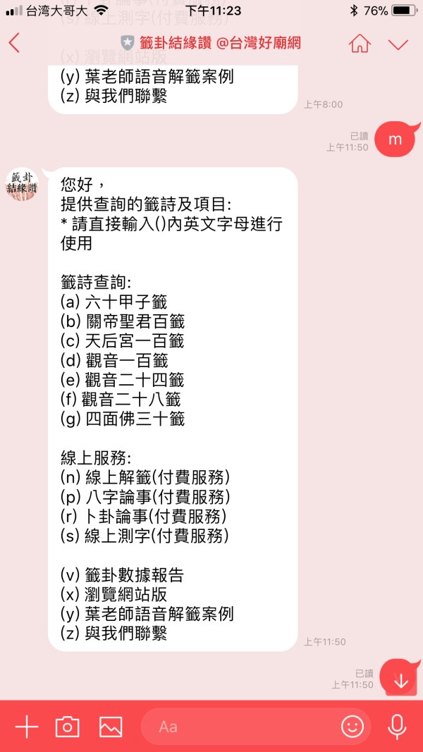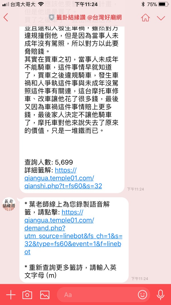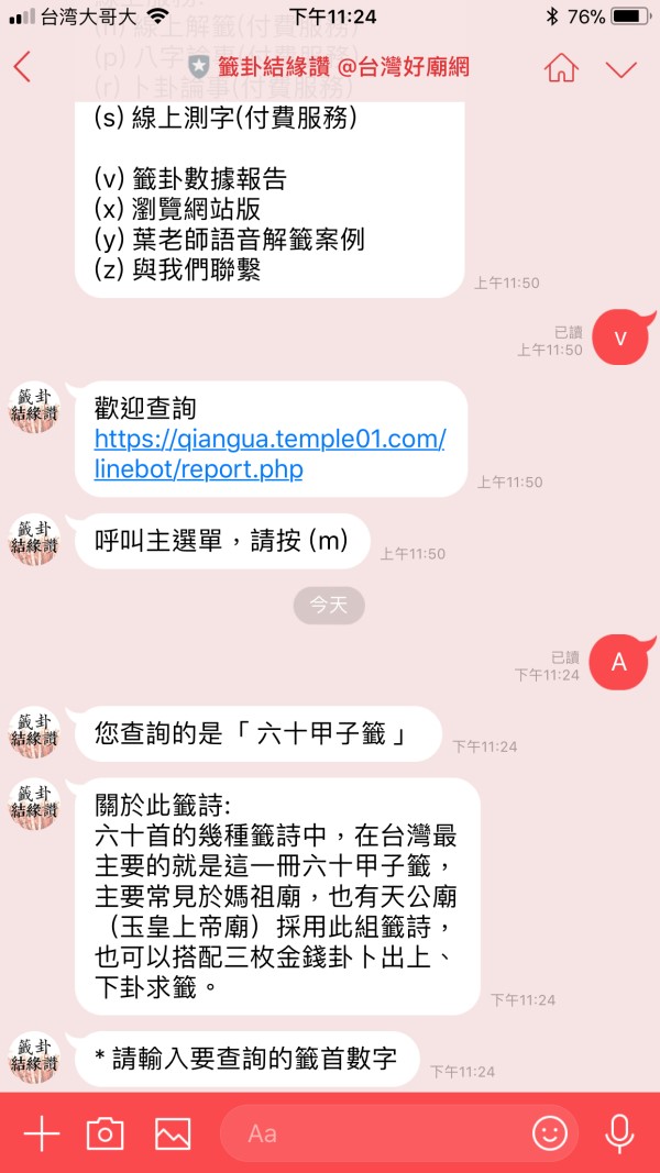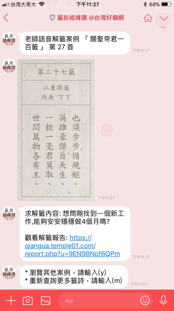LINE Bot(LINE機器人)服務《籤卦結緣讚》,可以查詢各籤詩內容,同時也可以線上解籤,同樣由老師針對你的問題,直接錄製語音來回答,卜卦、求籤方便、容易。